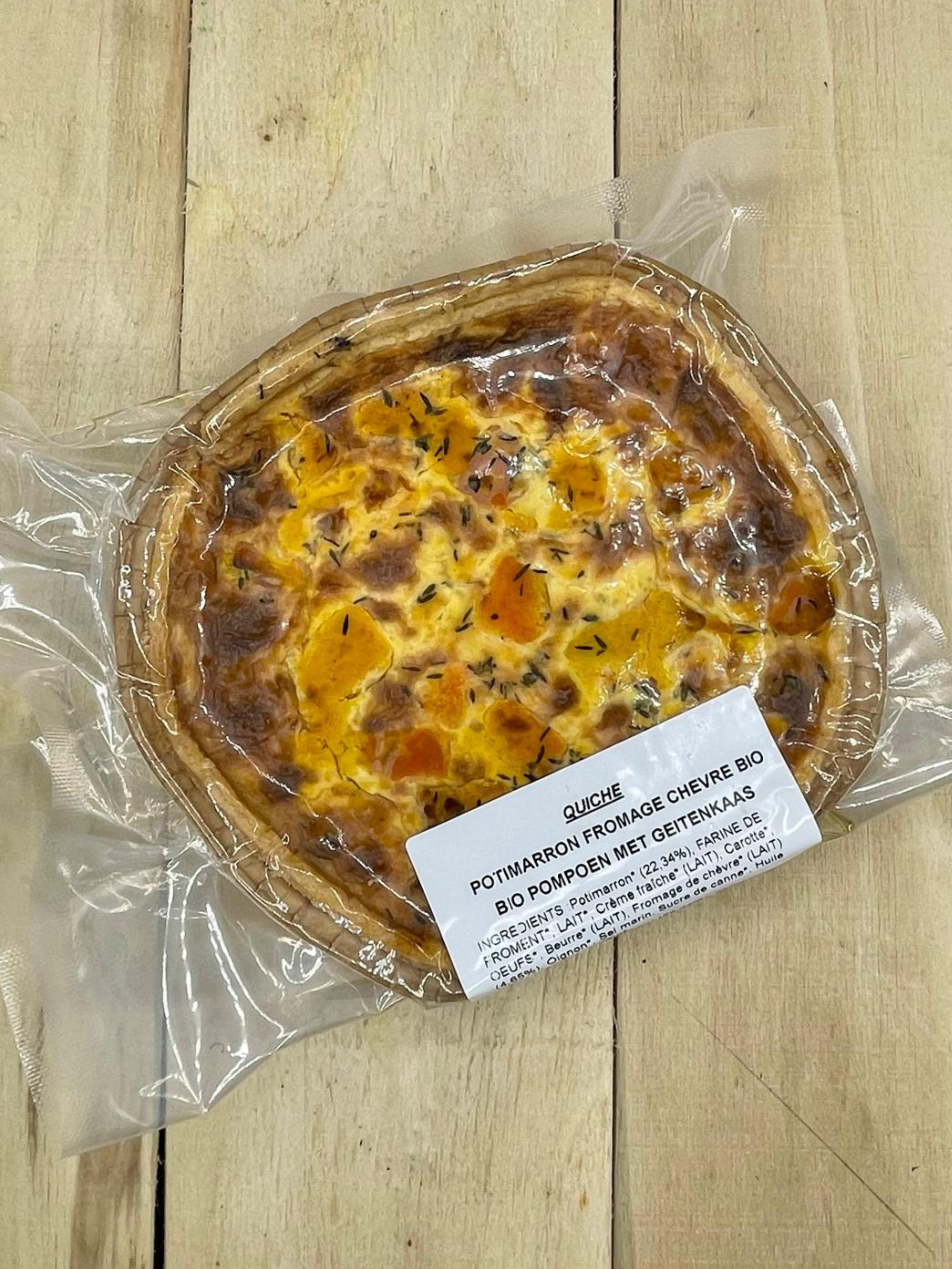 Ingrediënten*: potimarron (22,34%), tarwebloem, melk, verse room (melk), wortel, eieren, boter (melk), geitenkaas (melk), ui, zeezout, rietsuiker, olijfolie, tijm, kruiden.